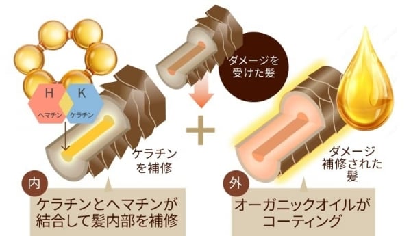 髪の主成分であるケラチン(*4)や、ケラチンと結合力の強い補修成分ヘマチン(*5)を配合。ダメージホールに入り込み、しっかり補修します。