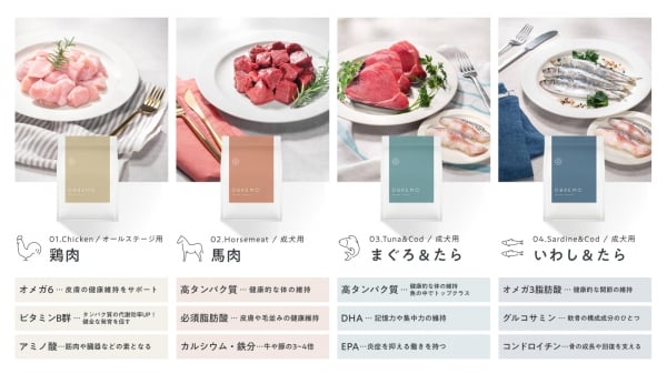 さらに、愛犬の体調や好みに合わせた選択肢をより増やしたいという想いからフードのラインナップの拡充にも力を入れており、現在では「鶏肉」「馬肉」「まぐろ&たら」「いわし&たら」を展開するなど、愛犬家の皆さまのご要望にお応えしてまいりました。
