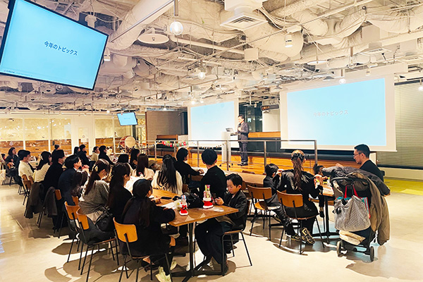 説明会の最初には、代表取締役社長の林からご家族に向けて会社説明を行いました。会社の沿革や各種サービス、新しくジョインした企業についてご家族にお話し、エイチームのことをより深くご理解いただきました。また、エイチームの企業文化や福利厚生についても説明を行い、エイチームの風通しの良い社風や社員が安心して働ける制度が整っていることも知っていただきました。