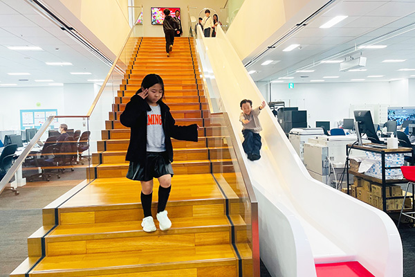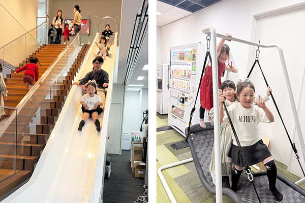会社説明の後は本社のオフィスを開放し、自由にオフィス内を見学いただきました。オフィスにあるすべり台やジャングルジム、キッズスペースはキッズに大人気。ご家族の皆さまが、社員が普段一緒に働いてるメンバーとあいさつを交わすなど、暖かな交流の時間となりました。