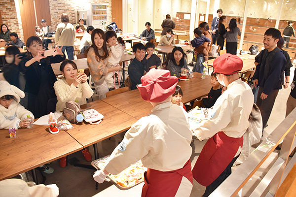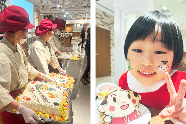 オフィスを見学した後は、社員食堂「Lapyuta」でお食事の時間です。社員が普段食べているメニューに加え、この日のための特製お子様メニューやクリスマスケーキもご用意しました。