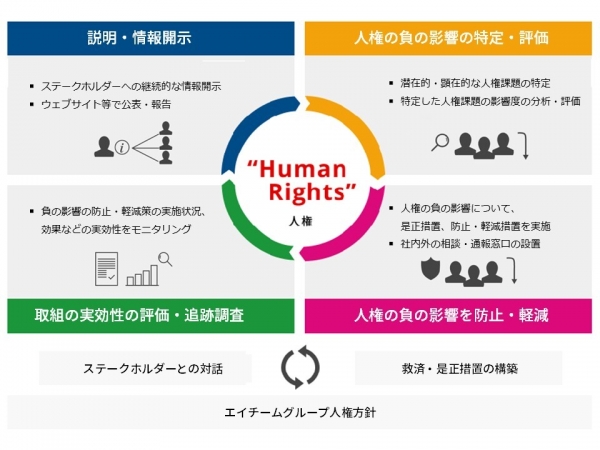 昨年、エイチームグループではサステナビリティプロジェクトの派生プロジェクトとして「人権プロジェクト」を発足させました。企業の持続的な成長において、人権を尊重する体制の構築が不可欠な経営基盤であるという認識のもと、国連指導原則やESG評価機関の評価基準を考慮し、約1年間にわたり活動を推進してきました。